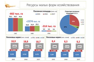 В части молочного скотоводства – за 2015-2017 годы в КФХ растет поголовье и КРС и коров (+258 и +101 тыс. голов соответственно).