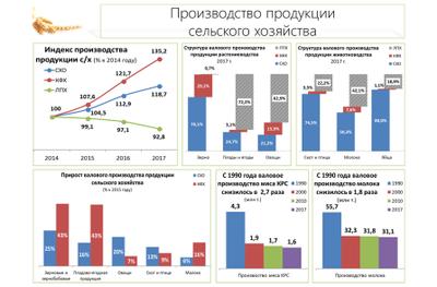 За период с 2015 по 2017 год удельный вес продукции сельского хозяйства, произведенной в КФХ, увеличился с 11,1% до 12,7%. Рост производства продукции в КФХ существенно превышает таковые в других формах хозяйствования. Соответствующий индекс в 2017 году в сельскохозяйственных организациях составил 105,2 пункта, в то время как в крестьянских (фермерских) хозяйствах – 111,1 пункта. Таким образом, по отношению к 2014, производство продукции в КФХ приросло на 35,2%, в СХО – на 18,7%, а в ЛПХ – снизилось до 92,8%.