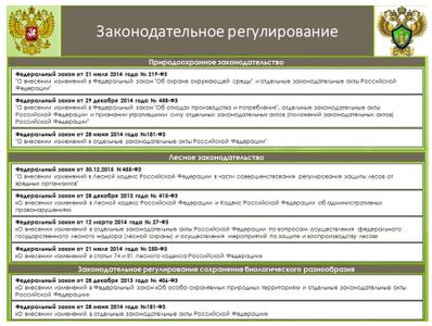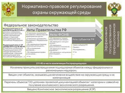 Приняты такие инициативы как федеральные законы № 455-ФЗ, № 415-ФЗ, № 406-ФЗ, № 219-ФЗ, № 458-ФЗ. Все они требуют эффективной реализации, и значительная роль в этом принадлежит Минприроды России и Росприроднадзору. Из приведённого списка особо хочу отметить два закона. Это 219-ФЗ (о нормировании) и 458-ФЗ (об отходах).