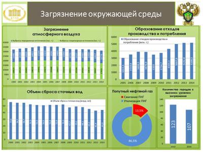Значительная часть населения по-прежнему живет в неблагоприятных экологических условиях, хоть и прослеживается тенденция к сокращению городов с высоким и очень высоким загрязнением воздуха. В 2013 году в России было 123 города с высоким и очень высоким уровнем загрязнения воздуха. В 2014 году их количество уменьшилось до 107. В приоритетный список городов с наибольшим уровнем загрязнения включены: Биробиджан, Благовещенск, Челябинск и др. Исключены Магнитогорск, Златоуст, Москва, Курган, Саратов и др.