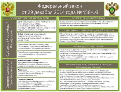 В отношении 458-ФЗ следует отметить, что он дополняет первый и направлен на конкретную область регулирования - обращение с отходами. Данный законодательный акт положил фундамент новой, более эффективной системы обращения с отходами.