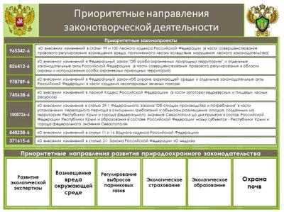 К приоритетным направлениям развития природоохранного законодательства Комитет относит вопросы совершенствования экологической экспертизы, возмещения вреда, регулирования выбросов парниковых газов.