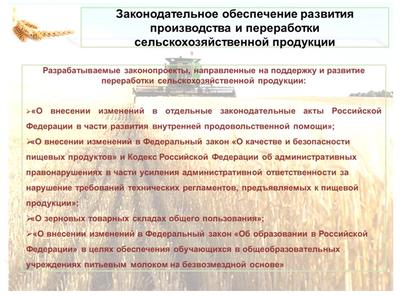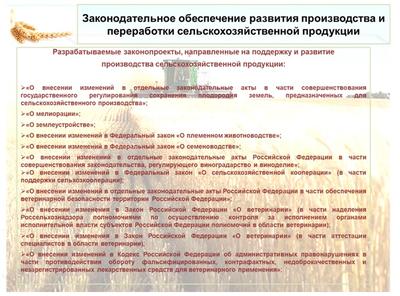 Все эти законодательные инициативы позволят нам эффективно укреплять и выстраивать правовую основу устойчивого развития агропромышленного комплекса и обеспечения нашего населения качественной продукцией. Кроме того, сегоня не имеют поддержки со стороны государства ни наши учхозы, ни наши сельскохозяйственные опытные станции. Нам надо решить этот вопрос, ведь именно там создают новые сорта и породы, технологии и машины, там производятся семена элиты и племенной скот.