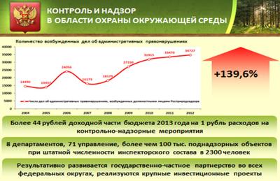 Не следует также забывать, что важнейшим вопросом является обеспечение эффективной природоохранной правоприменительной практики. В этой связи хочу заострить внимание на деятельности одной из ключевых структур Министерства природных ресурсов и экологии Российской Федерации - Федеральной службе по надзору в сфере природопользования. В ее составе 8 департаментов, 71 управление, более чем 100 тыс. поднадзорных объектов при штатной численности инспекторского состава в 2300 человек. Впечатляющие экономические показатели деятельности – более 44 рублей доходной части бюджета 2013 года на 1 рубль расходов на контрольно-надзорные мероприятия.