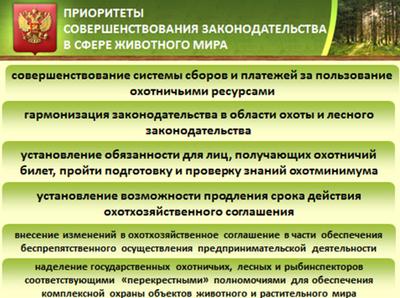 Приоритеты совершенствования законодательства в сфере животного мира в 2014 году определены в итоговом документе Совета по выработке и реализации государственной политики и нормативно-правовому регулированию в сфере изучения, использования, воспроизводства и охраны объектов животного мира и среды обитания, а также в области охоты при Министерстве природных ресурсов и экологии РФ.