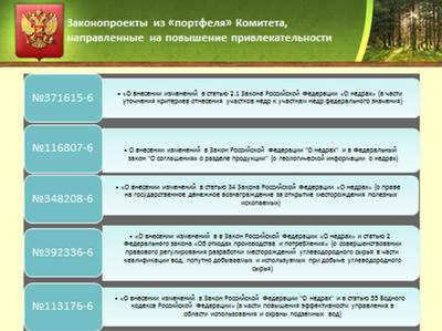 В настоящее время в портфеле Комитета находятся 14 законопроектов, связанных с пользованием недрами, воспроизводством минерально-сырьевой базы, отмечу наиболее важные из них: