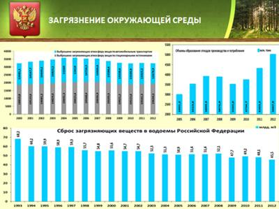 У нас же в этой части не все благополучно. На протяжении многих лет остается чрезвычайно высоким уровень загрязнения атмосферного воздуха. В 2012 году стационарными источниками было выброшено в атмосферу почти 20 миллионов тонн загрязняющих веществ, 12 миллионов тонн выброшено автотранспортом. Ежегодно образуется 4-5 млрд. тонн отходов. Их накоплено уже более 90 млрд. тонн.