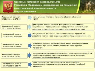 Для повышения рентабельности добычи минерального сырья была проведена комплексная налоговая реформа, внесены были изменения в Налоговый кодекс РФ, а также в Федеральный закон «О континентальном шельфе Российской Федерации» и Федеральный закон «О внутренних морских водах, территориальном море и прилежащей зоне Российской Федерации», которыми урегулирован порядок создания, эксплуатации и использования искусственных островов, установок и сооружений на континентальном шельфе, во внутренних морских водах и в территориальном море, в частности: