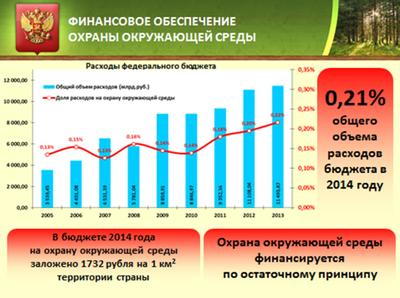 Отдельного внимания требуют вопросы финансирования природоохранных мероприятий. Расходы федерального бюджета по соответствующему разделу до сих пор формируются по остаточному принципу. На охрану окружающей среды в 2014 году в федеральном бюджете заложено всего 1732 рубля на 1 квадратный километр территории нашей страны или 0,21% расходной части бюджета (29,6 млрд. руб.). И это при всем известных экологических проблемах.