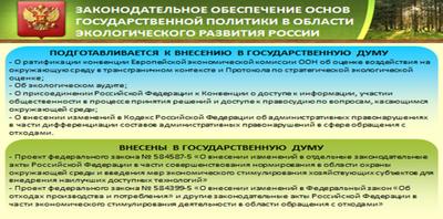 С целью улучшения ситуации в этой сфере некоторые вопросы решаются в законопроекте № 175151-6 «О внесении изменений в отдельные законодательные акты Российской Федерации по вопросу Байкальской природной территории». Законопроектом устраняются пробелы в законодательном регулировании отношений, возникших при осуществлении хозяйственной и иной деятельности на Байкальской природной территории, в части обязательности проведения государственной экологической экспертизы проектной документации объектов, строительство, реконструкцию которых предполагается осуществлять на Байкальской природной территории. Устанавливается запрет на размещение отходов производства и потребления I-III класса опасности.