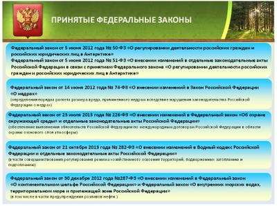 - Федеральный закон от 28 декабря 2013 года № 406-ФЗ «О внесении изменений в Федеральный закон «Об особо охраняемых природных территориях» и отдельные законодательные акты Российской Федерации» (в части приведения Федерального закона «Об особо охраняемых природных территориях» в соответствие с действующим законодательством);