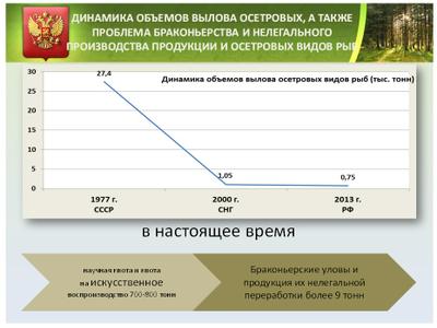В области сохранения водных биологических ресурсов отрасли мы также наблюдаем серьезные проблемы. Современное состояние ряда видов рыб и их отдельных стад на территории нашей страны вызывает серьезные опасения. Существенно изменилась фауна рыб рек Волга, Кама, нижнего течения реки Обь и других водоемов. Основные причины деградации - загрязнение воды, строительство гидротехнических сооружений - плотин, ирригационных систем, инвазии чужеродных видов, браконьерство. В России сосредоточены основные мировые запасы осетровых, значительная часть запасов лососевых и карповых рыб, но широкое развитие браконьерства может существенно снизить их запасы на реках Волга и Урал, на Камчатке, Сахалине и в реках Дальнего Востока.