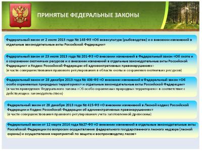 - Федеральный закон «О внесении изменений в статьи 5 и 10 Федерального закона «Об особо охраняемых природных территориях» и отдельные законодательные акты Российской Федерации» (проект № 348435-5) (в части устранения внутреннего противоречия, а также расширения перечня должностных лиц, уполномоченных на составление протоколов об административных правонарушениях, совершенных на ООПТ). Принят Государственной Думой 12 ноября 2014 года.