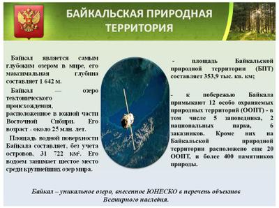 12 особо охраняемых природных территорий, в том числе 5 заповедников, 2 национальных парка, 6 федеральных заказников непосредственно примыкают к побережью Байкала. Кроме них на территории Байкальской природной территории расположено еще более 20 крупных ООПТ федерального и регионального значения. Общая площадь особо охраняемых природных территорий в границах Байкальской природной территории - более 4 млн. га.