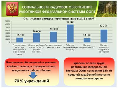 Среднемесячная заработная плата государственных инспекторов заповедников и национальных парков составляет всего 15,7 тыс. рублей, что почти в 2 раза ниже общероссийского уровня. И это при том, что государственные инспектора обязаны выполнять работу по выявлению и пресечению экологических правонарушений в сложных географических и климатических условиях, сопряженную с физическими лишениями, психологическими конфликтами, связанную с профессиональным риском. Фактически работа госинспекторов аналогична работе полицейских. При этом по статистическим данным среднемесячная заработная плата полицейского в Российской Федерации составляет 35,0 тыс. рублей.