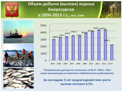 Сегодня уровень добычи водных биоресурсов фиксируется официальными источниками на уровне 4,2 млн. т. Доступная сырьевая база отечественного рыболовства ограничена величиной в 4,5 - 5 млн. тонн. На современном этапе ОДУ и запасы многих низкорентабельных видов водных биоресурсов не осваиваются в полной мере (например, сельди, сайры, кальмаров), в то же время промысловая нагрузка на ценные валютоемкие виды зачастую превышает допустимую, в том числе за счет браконьерства (краб камчатский, осетровые виды рыб).