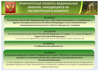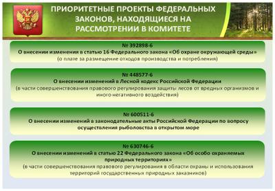 1) № 584399-5 «О внесении изменений в Федеральный закон «Об отходах производства и потребления» и другие законодательные акты Российской Федерации в части экономического стимулирования деятельности в области обращения с отходами». В настоящее время Комитет ожидает внесения поправок Правительства Российской Федерации, отсутствие которых сегодня является единственным сдерживающим фактором в его принятии;