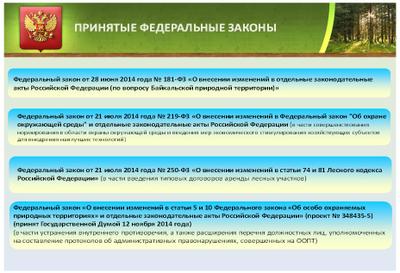 - Федеральный закон от 28 июня 2014 года № 181-ФЗ «О внесении изменений в отдельные законодательные акты Российской Федерации (по вопросу Байкальской природной территории)»;