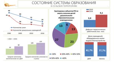 Количество образовательных учреждений имеет стабильную тенденцию к сокращению. К 2016 году в сельских территориях осталось всего 25 тыс. общеобразовательных учреждений и 14 тыс. детских садов. А этой соответственно в 2 и 3 раза меньше, чем было в 1990 году.