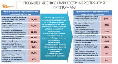 Срок очень сжатый, но с учетом накопленного опыта, я убежден, мы сможем эффективно разобрать эту проблему до основания. Предстоит сделать многое: определить реальную, а не среднестатистическую, потребность в дорогах, жилье, больницах, детских садах и школах, сколько мы должны возобновить сельских населенных пунктов, а главное, согласовать и увязать комплекс перспективных мер развития сельских территорий со всеми Государственными программами решающими вопросы социально-экономического развития Российской Федерации, а равно – обеспечить должный уровень внимания устойчивому развитию сельских территорий в важнейших стратегических документах – Стратегиях социально-экономического и пространственного развития Российской Федерации.