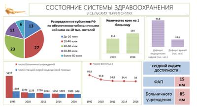 Сохраняет актуальность дефицит медицинских кадров. В 2016 году в сельской местности не хватало уже 94,8 тыс. медицинских специалистов, из которых 24,6 тыс. – врачи.