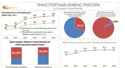 Транспортная инфраструктура сельских территорий усугубляет многие из названных выше проблем. Так, к примеру, территориальное удаление объектов образования и здравоохранения, от сельских населенных пунктов, с учетом качества и количества дорог, а также обеспеченности населенных пунктов автобусным сообщением, делает медицину и образование все менее доступными для сельских жителей.
