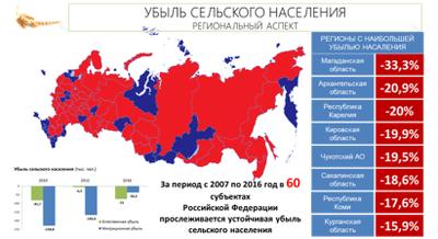 За период с 2007 года сельское население сократилось на 1,3 млн. человек. Устойчивая убыль населения прослеживается в 60 субъектах Российской Федерации. При этом наиболее острая ситуация складывается в Магаданской, Архангельской, Кировской, Сахалинской, Курганской областях, а также Республиках Карелии и Коми и Чукотском автономном округе. В указанных регионах убыль сельского населения составляет от 16% до 33,3%!
