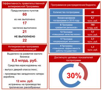 Кроме того, в рамках рассмотрения продуктивности субсидий, следует обратить внимание также на эффективность антикризисных мер, принимаемых Правительством. Опять же по данным Счетной палаты из 60 утвержденных пунктов антикризисного плана с точки зрения социально-экономического результата выполнено всего 17. Частично выполнено 21, а вовсе не выполненными можно признать 22 пункта.