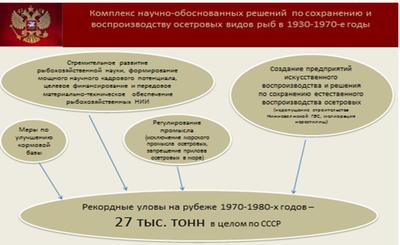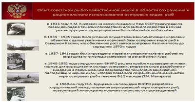 Рыбное хозяйство Советского Союза впервые столкнулось с необходимостью управления промыслом для поддержания запасов и недостатком научных данных для обоснования конкретных мероприятий в рамках государственного управления уже в послевоенные годы. В конце 40-х и начале 50-х годов в связи с развитием гидростроительства и потерей основных нерестилищ осетровых была проведена огромная работа по созданию научных основ и организации мероприятий по искусственному воспроизводству осетровых рыб.