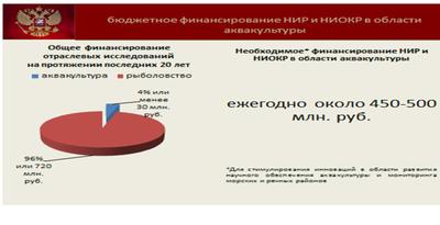 Вместе с тем бюджетное финансирование НИР и НИОКР в области аквакультуры на протяжении последних 20 лет не превышает 4% от общего финансирования отраслевых исследований, составляя ежегодно не более 30 млн. рублей. Научное сопровождение характеризуется фрагментарностью, дублированием, слабым приборным и технологическим оснащением, объективным старением научных кадров. Подобный подход к научному обеспечению аквакультуры и привел к инерционному характеру развития осетрового хозяйства.
