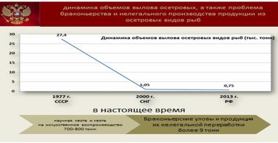 В 2013 году в бассейне Каспийского моря изъято более 60 км сетей, свыше 200 шт. специализированных орудий лова – аханов, более 160 тысяч крючьев, свыше 5 т рыбы осетровых видов. В естественную среду обитания выпущено свыше 1000 экземпляров осетровых, обнаруженных в незаконных орудиях лова в живом состоянии. В 2013 г. Российская Федерация ужесточила административную ответственность за незаконную добычу осетровых видов рыб и сегодня максимальное наказание за этот вид нарушения составляет - двести тысяч рублей с конфискацией судна и других орудий добычи (вылова) водных биологических ресурсов, в соответствии с Уголовным кодексом Российской Федерации - лишение свободы на срок до двух лет с лишением права занимать определенные должности или заниматься определенной деятельностью на срок до трех лет.
