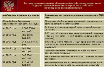 Так, при рассмотрении проекта бюджета 2015-2017 Комитет критически отметил в своем заключении к первому чтению, что законопроект в рамках Государственной программы Российской Федерации «Развитие рыбохозяйственного комплекса» не предусматривает подпрограмму «Развитие осетрового хозяйства» с соответствующими мероприятиями и объемами финансирования.