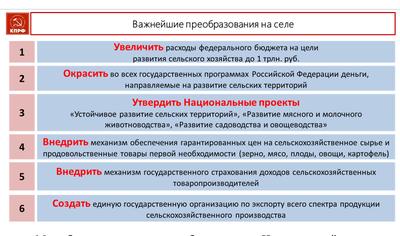 Мы убеждены, что должен быть принят Национальный проект по устойчивому развитию сельских территорий! Должен быть создан механизм, который гарантирует крестьянину достойную цену на произведенную им продукцию первой необходимости! Доходность в сельском хозяйстве должна быть застрахована, и так далее, и так далее.