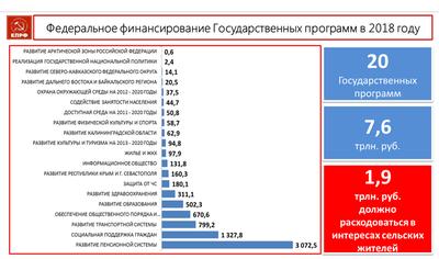Уважаемые товарищи, у нас 38 миллионов граждан живет в сельской местности. Это 25% населения России. Поэтому на развитие села должно идти из этой суммы 1,9 трлн. рублей по всем этим программам! А село для устойчивого развития территорий получает всего 16 млрд. рублей.