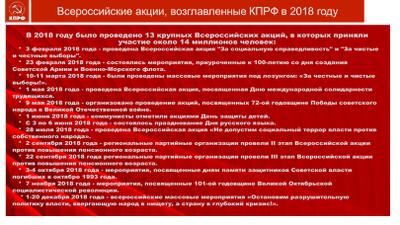 Протестная работа с населением, сочетаемая и дополняемая активной парламентской деятельностью депутатов фракции КПРФ формирует высокий авторитет партии среди народа. Именно КПРФ сегодня является политической партией, обладающей выверенной идеологией, строгой научной программой целей и действий, профессиональным подбором подготовленных кадров и четким, структурированным планом развития России. Мы опираемся на поддержку общества, сохраняем верность социалистическим традициям и устремлены в будущее. Определяющим для нас всегда будут великие исторические имена и события. Гений Ленина и Великий Октябрь открыли человечеству путь в будущее. Имя Ленина — мыслителя, философа, государственного деятеля, преобразователя навечно останется в мировой истории среди имен самых выдающихся личностей, внесших наибольший вклад в становление и развитие мировой цивилизации. Выдающийся организаторский талант и воля Сталина возродил Россию, сделал ее передовой индустриальной и научной державой мира, Красная Армия и оборонная промышленность многие десятилетия обеспечивали неприступность рубежей страны от посягательства врагов. Россия до сего времени живет, используя ресурс и потенциал, созданный поколением страны Советов. Мы бережно храним в памяти героическую историю своей страны, ее победы и достижения. Проведением торжественных памятных акции мы каждый раз пробуждаем в народе национальную гордость и осознание потомками величия и славы Родины. Именно в преемственности славных традиций поколений, в равнении на наследие героики предков заключена основа победного духа России, несгибаемого русского характера и залог возрождения ее могущества и процветания!