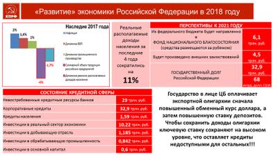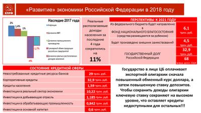 Обогащение «олигархата» за счет безмерно растущих поборов с трудящихся разобщает общество и ослабляет государство, делая страну привлекательной мишенью для агрессоров США и НАТО. Несмотря на множество звучащих заявлений власти о переходе к инвестиционной политике развития и презентованных «национальных проектах», Россия по-прежнему остается на нефтегазовой игле. Реальный сектор экономики стагнирует и разваливается. Производственные мощности промышленности используются на 20-60%. Доходы и полученная прибыль от продажи нефти не работают на развитие страны, а выводятся в зарубежные офшоры. Растет инфляция. Ее показатель по прошлому году вырос вдвое и базируется по оценкам экспертов на уровне 3,4-3,9%, а в текущем перешагнет 4%. Внутренний потребительский спрос не сформирован, а внешняя торговля в значительной степени подорвана санкциями Запада. Сдерживает империалистическую рьяность власти только страх, оценка потенциала силы ее отторжения обществом и гнев народного протеста. Впервые за последний десяток лет в 2018 году официальной статистикой в стране зафиксирован демографический провал – значительное снижение численности постоянного населения. Смертность превысила рождаемость без малого на 100 тыс. человек. Катастрофический для будущего страны результат явился прямым следствием правительственной минимизации медицины и здравоохранения, ее деструктивной экономической и социальной политики.