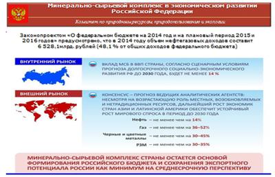 Получаемые доходы от использования минерально-сырьевого комплекса страны в настоящее время являются основным источником формирования доходной части федерального бюджета.Законопроектом «О федеральном бюджете на 2014 год и на плановый период 2015 и 2016 годов» предусмотрено, что в 2014 году объем нефтегазовых доходов составит 6,5 трлн. рублей (48,1 % от общих доходов федерального бюджета).