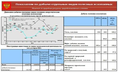 По данным Федеральной службы государственной статистики, за 2012 год, добыча полезных ископаемых по важнейшим видам продукции (общий объем / % к 2011 года) составила: