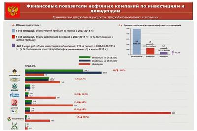 Вместе с тем, как показывает аналитика, нефтяные компании потратили за период 2007-2013г.г. только 10% от чистой прибыли в инвестиции в обновление основных фондов, при том, что на дивиденды ушло 27% от чистой прибыли. Особенно этим отличилась ТНК-ВР у нее на дивиденды ушло 625 млрд. руб, а инвестиции на 1.08.13 составили 21.6 млрд. руб.
