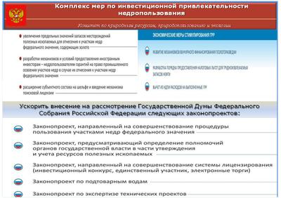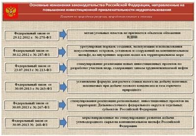 Для повышения рентабельности добычи минерального сырья была проведена комплексная налоговая реформа, внесены были изменения в Налоговый кодекс РФ, а также в Федеральный закон «О континентальном шельфе Российской Федерации» и Федеральный закон «О внутренних морских водах, территориальном море и прилежащей зоне Российской Федерации», которыми урегулирован порядок создания, эксплуатации и использования искусственных островов, установок и сооружений на континентальном шельфе, во внутренних морских водах и в территориальном море, в частности: