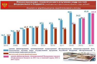 В соответствии с подпрограммой «Воспроизводство минерально-сырьевой базы, геологическое изучение недр» государственной программы Российской Федерации «Воспроизводство и использование природных ресурсов» объем бюджетных ассигнований на реализацию мероприятий составляет на 2014 год и 2015 год 41 млрд. руб. ежегодно, на 2016 год 42,2 млрд. руб.