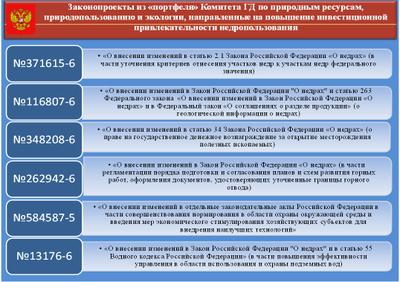 Кроме того, в «портфеле» Комитета находятся законопроекты, направленные на инвестиционную привлекательность пользования недрами: