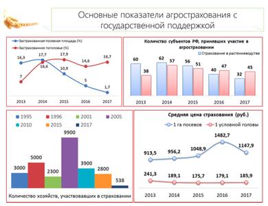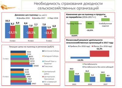 Кроме того, итоги работы сельскохозяйственной отрасли в 2017 году, характеризующиеся рекордным урожаем зерновых и не в меньшей степени рекордным падением цен на первичную сельскохозяйственную продукцию, определили целесообразность развития сельскохозяйственного страхования в направлении страхования доходности хозяйств. Страхование доходов сельхозпредприятий в западных странах (в т.ч. в Испании, Канаде, Китае, Германии и др.) зарекомендовало себя эффективным механизмом обеспечения рентабельности в отрасли, когда падение доходов возмещается страховыми компаниями.