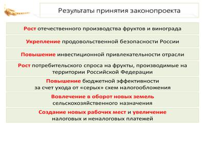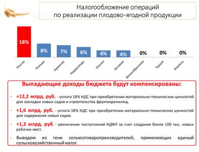 Кроме того, уменьшение поступлений налоговых отчислений от реализации плодово-ягодной продукции и винограда, будет компенсировано за счет уплаты 18% НДС при приобретении материально-технических ценностей для закладки отечественных садов и строительства фруктохранилищ. Согласно оценке экспертов Национального плодоовощного союза, в состав которого входят более 40 крупнейших российских агрохолдингов, сумма таких расходов производителей аграрного сектора составит около 80,1 млрд. руб., что соответствует размеру НДС 12,2 млрд. руб.