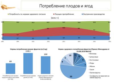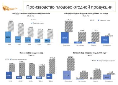 Так, в 2016 году было произведено лишь 3,3 млн. тонн плодово-ягодной продукции, из которых 2,4 млн. тонн – в хозяйствах населения.