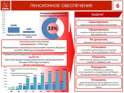 В принятых реформах было одно ключевое положение, в закреплении которого главная роль принадлежала фракции КПРФ: государство брало на себя обязательство ежегодно в феврале месяце увеличивать страховую пенсию на уровень инфляции прошедшего года. Но это положение проработало только год и было приостановлено партией власти. В этой связи, несмотря на 12,9% инфляции в 2015 году, в 2016 году пенсии были проиндексированы лишь на 4%.