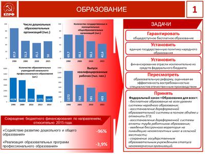 В итоге дошкольных образовательных организаций у нас сегодня уже на 38 тысяч меньше, чем было в 1990 году (50 тыс. против 88 тыс.). Мы потеряли 27 тыс. государственных и муниципальных общеобразовательных организаций (42,6 тыс. против 69,7 тыс. в 1990 году). Количество образовательных учреждений начального профессионального образования сократилось более чем в 4 раза (1007 против 4328 в 1990 году), из-за чего народное хозяйство недополучает почти 900 тыс. квалифицированных рабочих ежегодно.