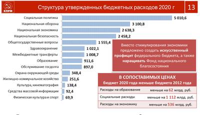 В сопоставимых ценах предложенные расходы бюджета ниже таковых в 2012 году – к примеру, на 62 млрд. рублей меньше расходы на образование, на 1,1 трлн. рублей меньше финансирование социальной политики, расходы на национальную экономику ниже на 536 млрд. рублей.