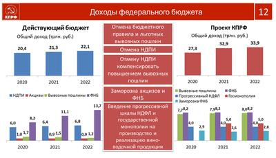 Бюджетное правило должно быть отменено, как и льготные таможенные вывозные пошлины. Также должно быть принято решение об отмене налога на добычу полезных ископаемых, а выпадающие при этом доходы бюджета будут скомпенсированы повышением вывозных пошлин. Добавив к этому прогрессивный налог на доход физических лиц, заморозив Фонд национального благосостояния на уровне 8,2 трлн. рублей, установив с 2021 года государственную монополию на производство и реализацию алкогольной продукции, мы выходим на целевые показатели.