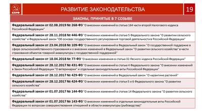 В числе уже принятых - законы, поддерживающие науку, и в первую очередь ее прикладную составляющую. Мы снизили НДС до 10% на плодовые и виноград. Принят отраслеобразующий закон «О виноградарстве и виноделии». Конечно же, наш закон, который мы пробивали два с половиной года, о горячем комплексном питании в школах сейчас принят Государственной Думой и в рамках бюджетного процесса мы вносим корреспондирующие правки в основной финансовый документ страны. Целый пакет законов мы приняли в экологическом блоке законодательства – это и экологическое нормирование, и новая система обращения с отходами. Сергей Левченко эффективно решил многие проблемы в лесной отрасли возглавляемого им региона, основываясь на наших законах, в которых прописано наказание для «черных лесорубов», в которых берется на строгий учет каждое дерево и делянка, в которых выстроена комплексная система обращения с круглой древесиной, включая ее переработку.